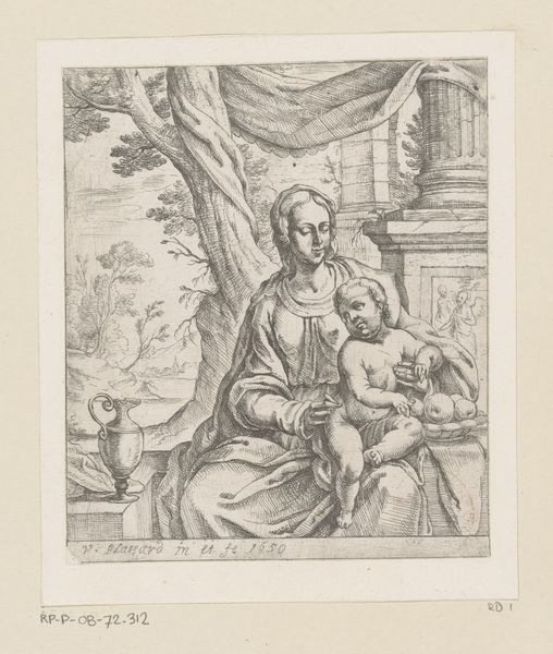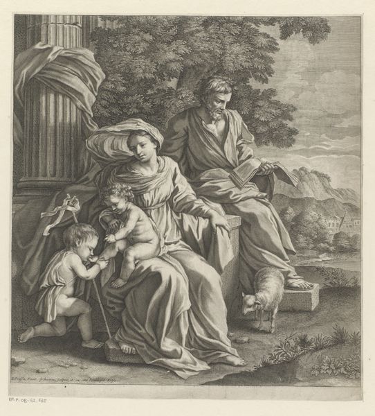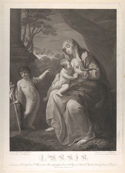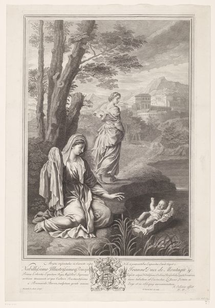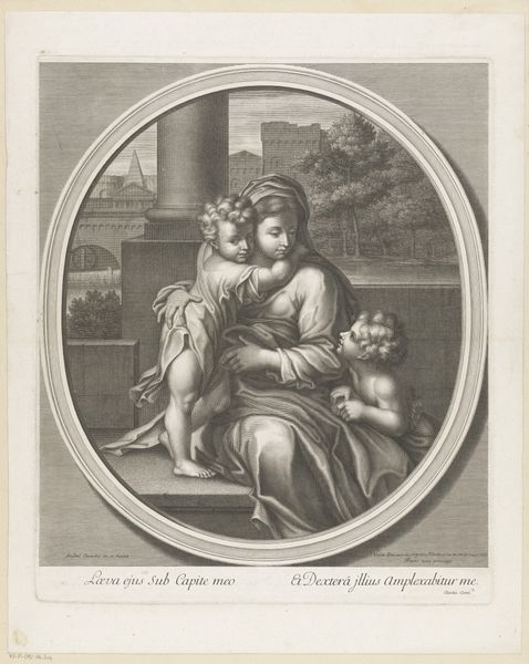 Giovanni Girolamo Frezza made this print titled 'Latona met Diana en Apollo'. Frezza was working in Italy during the Baroque period. This was a time when the Catholic Church was a major patron of the arts. It used art to promote its teachings and values. Frezza worked at a time when printmaking was becoming an increasingly important medium for disseminating knowledge and ideas. The image depicts Latona, the mother of Apollo and Diana, fleeing from Juno, the wife of Jupiter. The visual codes of classical mythology create meaning through cultural references and historical associations. The story of Latona, Apollo, and Diana was a popular subject in art during the Baroque period. Artists used it to explore themes of motherhood, persecution, and divine power. To understand Frezza's work more fully, one might research the printmaking industry in 18th-century Italy or explore how artists and patrons challenged social norms by reinterpreting classical stories.