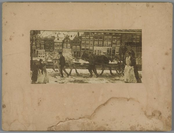 Editor: So, this is "Ossenkar in landschap" – "Ox cart in landscape" – a photograph taken in 1887 by A. Foncelle, using the albumen print process. The sepia tones give it such a nostalgic feel, and the composition, with the oxen pulling the cart, seems to evoke a simpler, more agrarian past. What visual cues jump out at you? Curator: Well, let's consider what the ox and the cart would have signified in 1887. The ox, often depicted in art throughout history, embodies patience, strength, and unwavering labor. It's a symbol of sustenance, representing the agricultural backbone of society. Even today, we recognize those qualities. How do you think that symbolism affects our viewing experience? Editor: I suppose it makes me think of hard work, and maybe even a kind of humble acceptance of one’s place in the world. There’s nothing flashy about it, just a quiet dignity. Curator: Precisely. And the landscape itself becomes a character. Note how the trees, even in soft focus, seem to offer a kind of silent witness. This landscape, combined with the figures, reflects our complex relationship with nature—simultaneously a source of sustenance and a representation of something larger. Does this then change how you perceive the piece? Editor: Definitely. It's more than just a pretty picture; it's like a window into a cultural memory, reminding us of where we came from and what we once valued. Curator: Exactly! It underscores how seemingly simple images can resonate with collective experiences, preserving and transmitting cultural values across time. I’ve learned a lot as well; considering symbols more deliberately certainly deepened the experience. Editor: I totally agree. Now I see this photograph less as a snapshot of the past, and more as a mirror reflecting our ongoing relationship with history, labor, and the land.