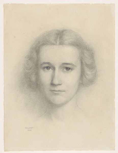 Curator: Here we have a portrait drawing from the 19th century, created by the German artist Eugen Eduard Schäffer. Editor: It's arresting, isn't it? Even unfinished, there's a delicate serenity. The shading gives such a soft, almost dreamlike quality. Curator: Schäffer, while not a household name today, was working within a very specific social framework. Portraiture during this period served as a marker of status, and even sketched portraits signified access and connections. It served to document the individuals, and by extension, the social milieu. Editor: Agreed. But look how the graphite is laid down. There’s almost a sense of volume, a sculpting with light and shadow. The face is delicately modeled, contrasting with the much sketchier rendering of the hair. The hatching marks lend a directionality which flattens into the top portion of the hair, which almost recedes, whereas the curls create more visual interest. Curator: Indeed. The contrasting degrees of completion imply perhaps it was preparatory drawing and offers insights into his technique. These images played a vital role in constructing and reinforcing social hierarchies. Editor: Although the gaze seems serene, I find her stare penetrating. There’s also something intimate, like we are viewing a private study rather than a completed artwork meant for public display. Curator: I agree; there's a tension in it. The act of sitting for a portrait, even an unfinished one, was a negotiation of power dynamics. Who commissioned the portrait? Was it the woman herself, a family member, or perhaps a prospective suitor? That would tell us so much about the portrait’s public function. Editor: Ultimately, whether study or finished portrait, I appreciate how this portrait offers a beautiful exploration of light and form. Curator: And perhaps it allows us to glimpse at a moment in time. A reminder of the societal roles at play, even in a seemingly quiet drawing like this.