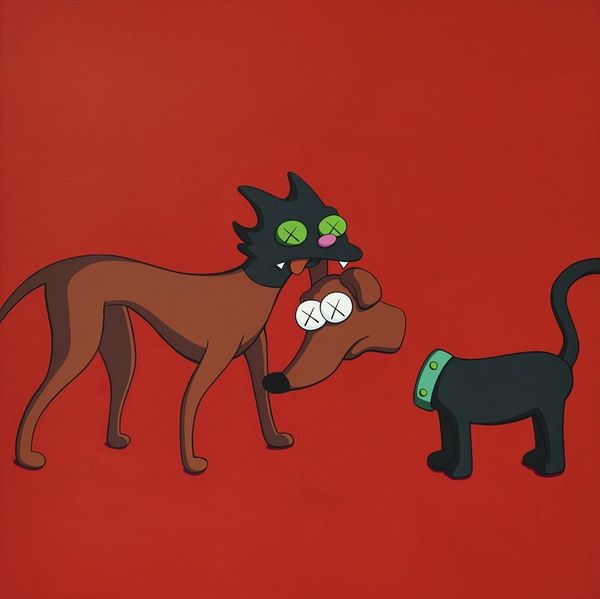 Kaws' 'Kimpsons #8' is a painting that's all about smooth surfaces and bold color blocking, made with acrylic on canvas. The flat, almost cartoonish application of paint gives it a graphic, screen-printed vibe. It's like Kaws is pushing back against the idea of the artist's touch, of expressive brushwork. Instead, we get this super clean, almost mechanical finish. The solid purple background, the bright, unwavering yellow of the skin, the stark red dress. It's a color world that’s both familiar and slightly off-kilter. I'm really drawn to those crossed-out eyes. It’s a simple gesture, but it totally transforms the character, turning Marge into something more melancholic, more knowing. It reminds me a bit of Warhol's pop appropriations mixed with a dash of Basquiat’s subversive edge. In the end, it's all just paint, stretched on canvas, but what a world of feeling it can hold, right?