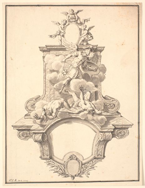 This is Skulpturudkast, a drawing by Johannes Wiedewelt, made sometime in the 1700s. The medium here is pen on paper, a classic combination, but one that has its own resonance. You see, the monument this drawing proposes would have been made of stone, likely marble. This material, quarried with great human effort, was the very stuff of empires. But here, it is translated into a humble, linear sketch. The ease with which the artist's pen glides across the page is a counterpoint to the immense labor required to produce a monumental sculpture. This drawing is a vital step in the process, one in which the hand and the mind come together to give form to ideas, before they are rendered in much more expensive and permanent materials. This emphasizes that while the final product is impressive, it's the initial spark of creativity, captured here on paper, that truly matters. The social context of artistic production comes alive in the contrast between the grandiosity of the sculpture and the modesty of its initial conception.