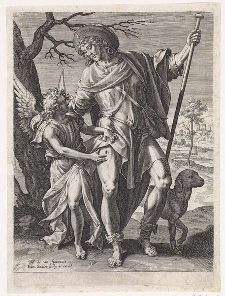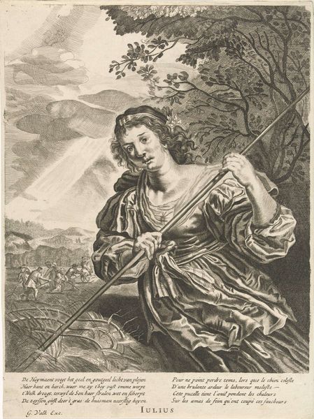 Editor: This is Agostino Veneziano's "The Cumaean Sibyl," created around the early 16th century. The landscape feels so alive. What symbols do you see at play here? Curator: The Sibyl herself is a powerful symbol of prophecy and fate. Note the radiant sun – perhaps representing enlightenment or divine knowledge granted to her. The dog at her feet might symbolize fidelity or guidance. Consider how these motifs contribute to her legendary status. Editor: That’s a great point about the symbols supporting her narrative! Curator: Indeed. Images like this carried weight, shaping cultural memory, linking the present to classical antiquity and its archetypes. Are there any other figures that come to your mind? Editor: The Sibyl reminds me of Cassandra, cursed to see the future but never be believed. Thank you for helping me unlock the symbolism within this piece! Curator: My pleasure! Recognizing these cultural echoes enriches our experience of art.