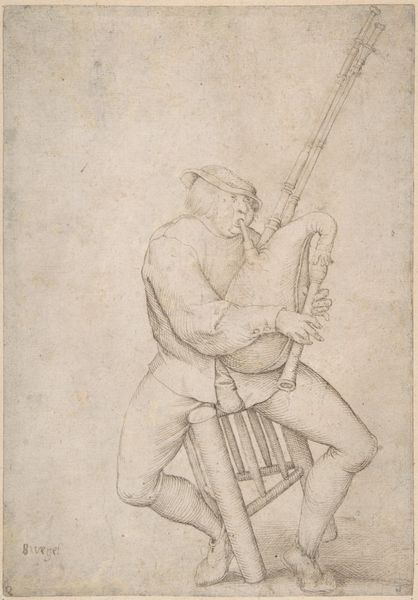 Curator: This engaging work, created between 1640 and 1660, is titled "Seated Old Man Facing Right, Singing and Holding Music," attributed to Anton Crussens. Editor: My first impression? It’s the dynamism created with such delicate linework. A sort of theatrical moment, caught in ink, with that face, somewhere between amusement and grotesque agony. Curator: Indeed. Let’s consider the social context. This piece emerged during a period of immense social upheaval across Europe, marked by the Thirty Years’ War. These images, reproduced through prints, would be available for different social classes and offered ways to explore shared humanity and also expose caricatures that could be harmful. The aged man, perhaps a minstrel or beggar, represents both a romanticism of the common man and an indictment of societal neglect. Editor: I see it also through the interplay of shadow and light, achieved purely through line. The concentration of lines define his profile and garment contrasting with the softer rendering of the background. It evokes an emotional resonance that transcends its physical medium. The circular composition, the limited value range...it is quite powerful. Curator: Precisely. Consider the historical reception; genre scenes depicting the lower classes were gaining traction, offering commentary on social stratifications. Does it mock, empathize, or simply observe? And for whom? The gaze of this character certainly feels challenging. Editor: I appreciate how the artist harnesses visual techniques like hatching to give shape and volume to the old man's figure. And the musical text is rendered so precisely, albeit illegibly—inviting viewers into this sonic moment. It's masterful control within simplicity. Curator: The work provides a window into how age, poverty, and artistic expression were viewed and circulated through visual culture. Editor: Ultimately, it's about form, and the capacity of this singular form to transcend time and continue its provocative humanness to this day.