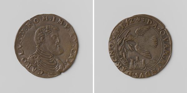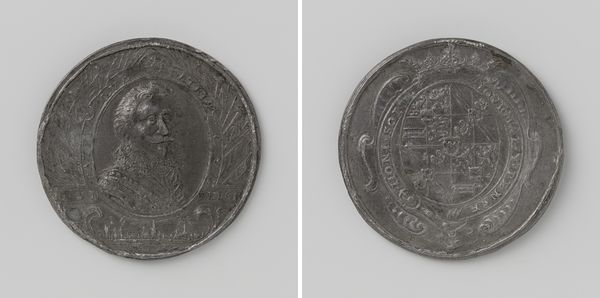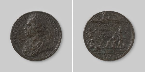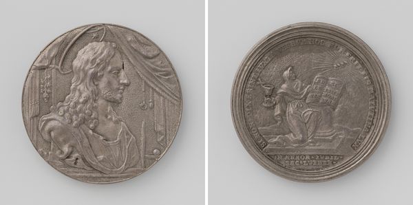 Editor: So this medal, "Peace of Rijswijk between the Allies and France 1697", by Reynier Arondeaux... I’m struck by the contrast between the stern portrait on one side and what seems like a more allegorical scene on the other. It’s a metal relief, which feels quite permanent, you know? It gives me a solemn vibe, like it wants you to take history seriously. What catches your eye? Curator: Oh, that stern portrait whispers of power, doesn't it? Louis XIV, I presume, gazing out with all the authority he can muster! But it's that allegorical figure on the reverse that really sings to me. Floating on a bed of clouds, basking in radiant light… she embodies not just peace, but hope, a new dawn. Notice the way Arondeaux juxtaposes these two: earthly might versus divine grace, ambition tempered by wisdom. This medal is almost like a tiny portable stage for the tensions of the time. Does the scale influence your sense of the narrative? Editor: Absolutely! I hadn't considered the scale, but the smallness of it almost makes it feel more intimate, like a secret message from the past. All that power condensed! I suppose it circulated pretty widely back then, didn't it? Curator: Indeed! Imagine this tiny drama changing hands, each owner contemplating its layered meaning. A king's face on one side, a symbol of peace on the other – a constant reminder of the price and promise of accord. Do you think these historical themes remain pertinent today? Editor: Definitely. Peace is always relevant, I guess. It makes you think about the relationship between individuals and powerful events. Curator: Exactly! And perhaps, even, the power of art to immortalise, interpret, and even subtly shape those events. Editor: I never really thought about it like that. Now I feel I appreciate how metal, style and theme create historical context. Curator: Me neither. Onwards!