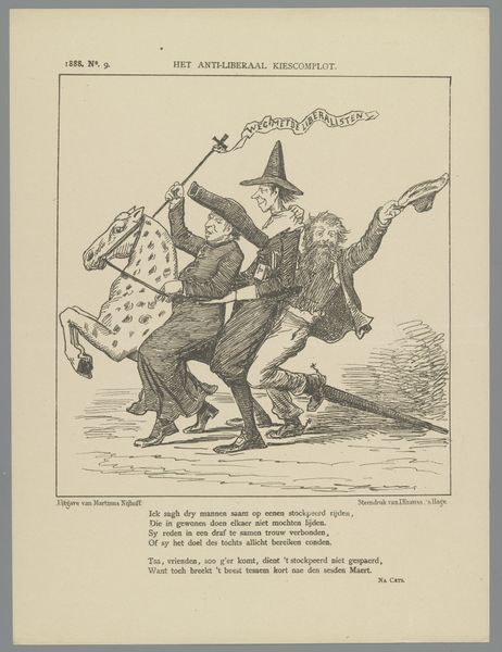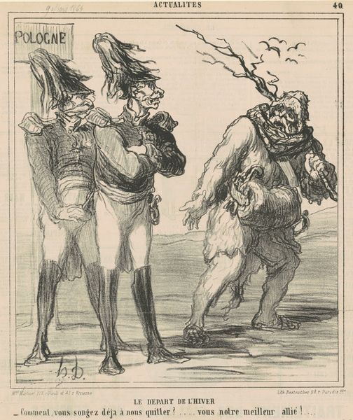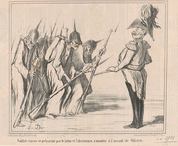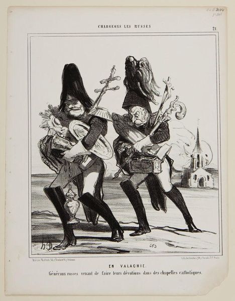 Editor: This lithograph, "En Valachie" by Honoré Daumier, likely from the 19th century, presents quite a comical scene. The exaggerated features of the figures and the almost frenzied lines give it a really satirical edge. What's your read on it? Curator: The figures carry such weighted symbolism! Consider the tall hats, almost caricatures of authority, and the way each character cradles a precious, almost absurd object. Their posture… it’s not reverence, but something closer to burdened obligation. Does it remind you of other images where figures are satirizing authority? Editor: I see what you mean! The church in the background feels really interesting because it stands in stark contrast to the figures and suggests maybe a point of tension between faith and these characters' caricatured representation of Russian generals. The title references Valachie (Wallachia), adding another layer. Curator: Precisely! Daumier here pulls from a well of cultural memory—a period rife with political tensions. The almost aggressive strokes used in the lithograph highlight the clash between the solemnity of religious devotion and the perhaps corrupt or self-serving nature of authority. How does this impact our understanding? Editor: I think it helps to understand Daumier's own political leaning in his lifetime and the social environment and artistic style and how those shaped what I’m looking at today! Curator: And the longevity of satire… do these characters remind you of anything today? Editor: Absolutely! Even without knowing the specific historical context, there’s something inherently recognizable about poking fun at authority. This has been incredibly enlightening. Curator: Indeed! Seeing the enduring relevance of visual symbols across time is fascinating, isn't it?