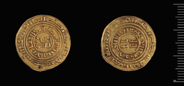 Curator: Here we have a gold coin, "Coin of Herakleios", struck by Abd-al-Malik of the Umayyads, a fascinating historical artifact housed here at the Harvard Art Museums. Editor: It feels weighty, doesn't it? The gold has such presence despite its small size. The figures feel so rigidly posed, almost iconic. Curator: Indeed. The Umayyads initially adopted Byzantine coin designs. You see Herakleios and his son on one side, a cross on steps on the other. It's a visual bridge between empires. Editor: So much power and transition encapsulated in this little disc. Makes you think about what stories it could tell if only it could talk. Curator: Absolutely. It offers a window into a complex moment of cultural exchange and adaptation. I always feel a deep connection to the past when I look at it. Editor: And I'm struck by its physical endurance – how it still gleams across the ages.