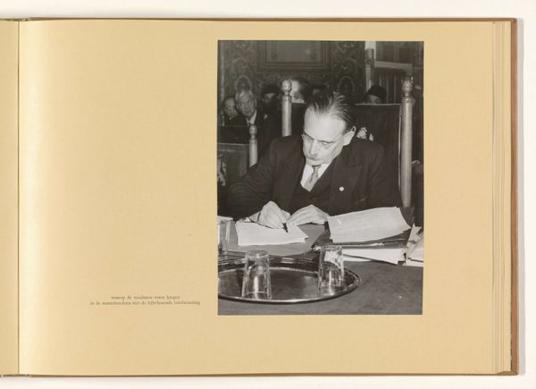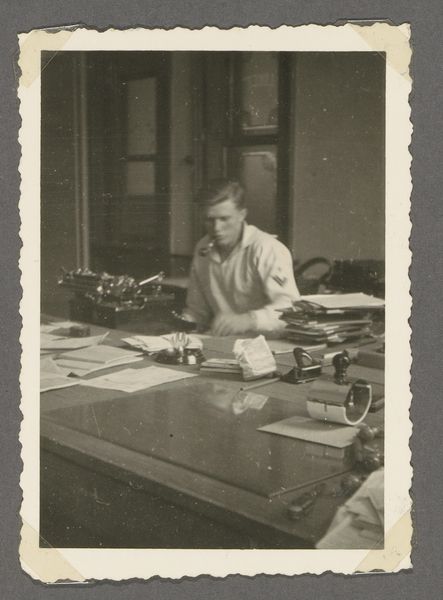 Editor: Here we have "Gouverneur-Generaal H. van Mook," a gelatin silver print photograph taken sometime between 1945 and 1946 by Anefo. The mood seems very serious, almost clinical, with the subject framed within the rigid geometry of his office. What do you see in this piece from a formalist perspective? Curator: The most striking element, from a formalist lens, is the stark contrast. Note the interplay between light and shadow across the composition. The geometry, as you mentioned, is key. The artist uses horizontals – the desk, the lines of the wood paneling – to create a sense of order. However, these lines are disrupted by the curves of the lamp and the various objects on the desk, generating a visual tension. Editor: So the contrast and geometry are critical. What about the texture? The photograph being gelatin silver print, does that particular materiality mean anything for the aesthetic experience? Curator: Absolutely. The gelatin silver print process lends a particular quality to the greyscale. Note how the gradations of tone produce an almost velvety texture in the darker areas. This creates a depth and richness that might be lost in a different photographic process, enhancing the perception of a very meticulous, and therefore perhaps even imposing figure. Also, look at how the grain emphasizes the realism characteristic of the piece. It refrains from idealizing, pushing against artifice. Editor: That’s a very insightful analysis, I had only thought of it in terms of subject matter! Curator: Formalism pushes us beyond the subject and asks: how does the visual structure communicate meaning? Perhaps that attention to minute details also reflect qualities, say of the subject. It creates meaning regardless of intention, only based on forms and materials at hand. Editor: I see. Paying attention to the structure makes it easier to move beyond the literal and engage with the artwork in a new way. Thank you!