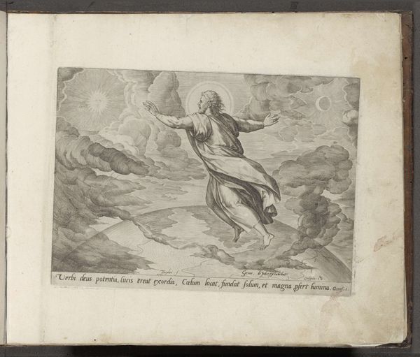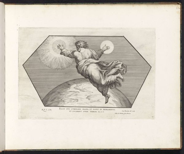 Cesare Fantetti created this print titled 'Schepping van hemel en aarde.' The artwork depicts a bearded figure suspended above a sphere, within a hexagonal frame. The composition is dominated by the contrast between the detailed figure and the more simply rendered earth below, set against a textured sky. The figure's dynamic pose and flowing drapery introduce a sense of movement, while the geometric frame provides a structured boundary. The earth is depicted as a gradient of swirling lines that suggest its spherical form. This contrast between the figure’s dynamism and the structured composition creates a tension that invites interpretation, perhaps suggesting the artist’s engagement with ideas about creation and order. The hexagonal border of the artwork and the earth is a closed form. This formal choice encourages us to contemplate how Fantetti uses geometric shapes to represent complex theological ideas. By analyzing these visual components, we gain insight into the cultural and philosophical discourse surrounding creation and representation during Fantetti's time.