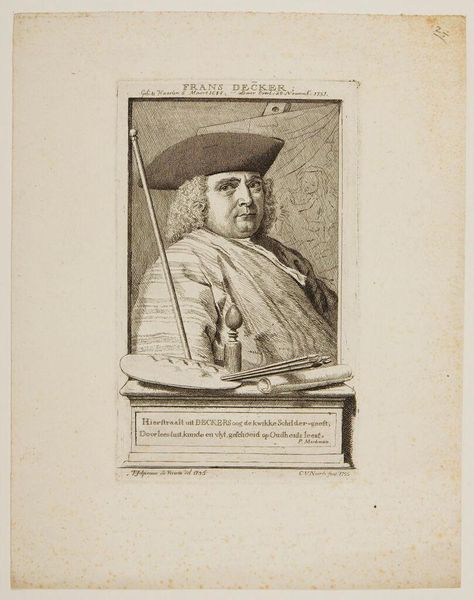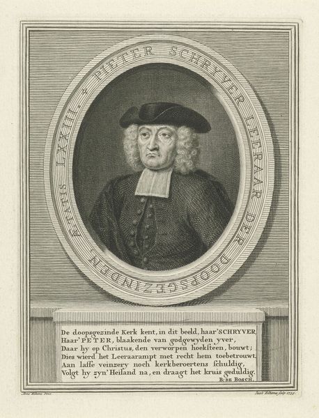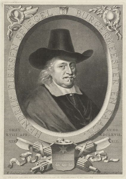 Curator: This is Jacobus Houbraken's portrait of Hendrik Dirkszoon Spiegel, a civic figure in Amsterdam. The framing gives it a certain weight, doesn’t it? Editor: It does, a formality that speaks to the subject's status. The oval border and precise hatching direct our gaze intensely towards his face and particularly that piercing gaze. Curator: Portraits like these, especially of civic leaders, often employed symbols of wisdom and stability. I wonder what cues we might find in his clothing or expression. Editor: Observe how the hat casts a shadow, partially obscuring the eyes, giving an air of mystery and perhaps even a hint of cunning, balanced by that lace collar. Curator: The choice of attire, while somber, also suggests a level of intellectual authority, fitting for a man of influence in 17th century Amsterdam. Editor: Ultimately, the engraving’s stark contrast emphasizes line and form, allowing the character of Spiegel to emerge subtly from the patterned surface. Curator: A testament to how portraiture can capture not just likeness but a moment in cultural history. Editor: Indeed, a study in how visual language shapes our perception of power and personality.