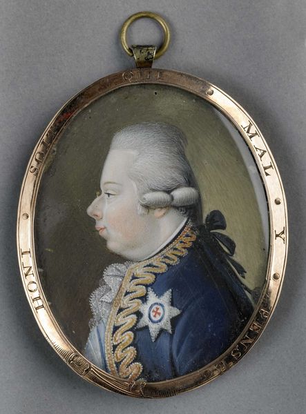 This is a miniature portrait of Willem V, Prince of Orange-Nassau, crafted by an anonymous artist. It’s made from delicate strokes of paint on ivory, encased in metal, and is incredibly small, only about 4 centimeters high. The smooth surface of the ivory allows for fine detail, especially noticeable in the prince’s powdered wig and the ornate details of his uniform. Miniatures like this were luxury objects, prized for their intimacy and portability. They required immense skill to create, and were often commissioned by the wealthy or aristocratic classes. The labor-intensive process of painting on such a small scale reflects the value placed on craftsmanship and personal connection in a pre-industrial world. These miniatures moved between the status of jewelry, diplomatic gifts and intimate keepsakes, always with the function of cementing social bonds. Appreciating the craft and context of this portrait gives us a window into the social and political life of the 18th century, challenging our modern expectations of art.
