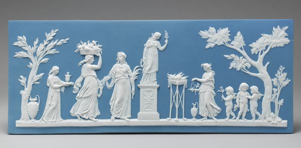 This delicate jasperware plaque, made by the Wedgwood Manufactory, depicts a scene brimming with classical motifs. The most prominent of which is the figure of Cupid, the god of love, here multiplied and commodified. Cupid's image has taken many forms throughout history. Originally, he was depicted as a powerful, mature god. Over time, he has morphed into the cherubic figure we see here, a symbol of innocent desire. Note the cage, evoking both captivity and vulnerability. In ancient Pompeii, similar images adorned the walls of villas, a testament to love's enduring power. This Cupid seller, however, presents a twist—love as a transaction, a commodity to be bought and sold. This speaks to a modern sensibility, a world where even the most sacred emotions can be subject to market forces. The image of Cupid, once a symbol of divine love, now flits between desire and commerce, forever caught in the currents of cultural memory.