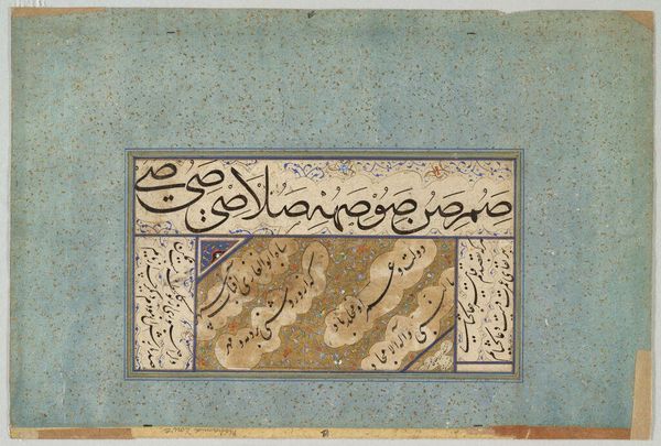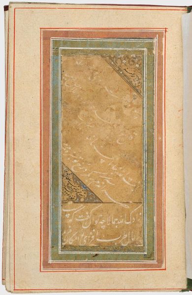Curator: We're looking at "Cautionary Verses by Safi," a calligraphic folio by 'Imad al-Hasani. The artwork is part of the Harvard Art Museums collection. Editor: Initially, I’m struck by the dynamic arrangement of the script and the ornate framing. It feels both ordered and surprisingly free-flowing. Curator: The text, arranged diagonally, does create a sense of visual movement. The verses themselves, though cautionary, are presented with such refined artistry. Calligraphy, of course, carries deep cultural weight, often seen as a sacred act. Editor: Exactly. The sweeping curves of the script, combined with the gold and blue flourishes around the edges, suggest a kind of controlled exuberance. It's as if the message transcends the words themselves, becoming a visual expression of spiritual discipline. Curator: The choice of colors—the vibrant green border contrasting with the intricate inner frame—might symbolize the balance between worldly concerns and spiritual aspiration. Editor: Interesting. Perhaps the artist seeks to find harmony between the aesthetic form and the underlying message. Curator: I see a merging of text and image to convey a larger cultural memory. Editor: This work really shows how material components contribute to symbolic meaning.