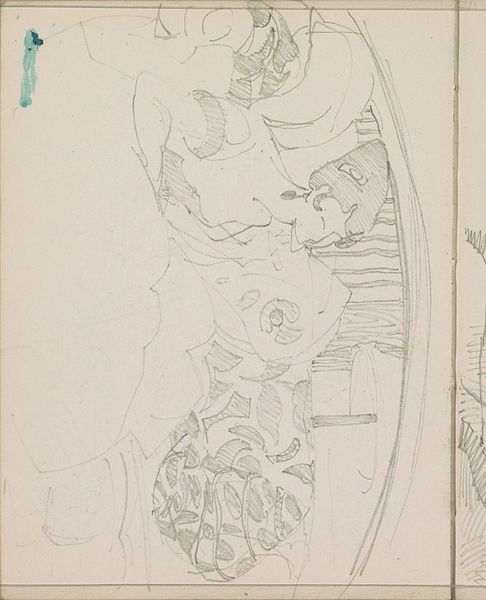 Editor: This is "Interior with a Standing Figure Beside a Reclining Nude Woman," a pencil drawing from around 1916 currently held at the Rijksmuseum, by Reijer Stolk. It feels very ephemeral and almost dreamlike because the lines are so faint. What compositional elements stand out to you? Curator: Primarily, the contrast in line weight and density commands attention. Notice how the artist uses very delicate, almost tentative lines to describe the figures and interior space. There's an apparent incompleteness, wouldn't you say? As though the work remains in a state of becoming. Editor: I do. It feels like a fleeting moment captured in a sketch. But is that all there is to it? Curator: Not entirely. Examine how the standing figure is more defined, more structurally assertive than the reclining nude. How does that dynamic interplay function within the composition? Does it evoke a certain psychological tension, or a spatial ambiguity? The lack of tonal variation forces us to concentrate on the artist’s marks themselves, their direction and their relationship to one another. Editor: It definitely makes you consider the relationship between the figures and their environment because the level of detail is so different, right? It really underscores that sense of ambiguity. I also noticed there’s more geometric, angular lines in the standing figure versus soft curvy ones in the reclined one, which sets a more pronounced contrast. Curator: Precisely. It's through these formal oppositions, through this calculated use of line and form that the drawing constructs meaning. Disregarding representational concerns entirely, it foregrounds the material and its manipulation. What has this exercise shown us, would you say? Editor: I've learned to appreciate how even a seemingly simple sketch can communicate complex relationships through purely formal means. Curator: And that meaning resides within the aesthetic experience itself. The intrinsic elements themselves create significance.