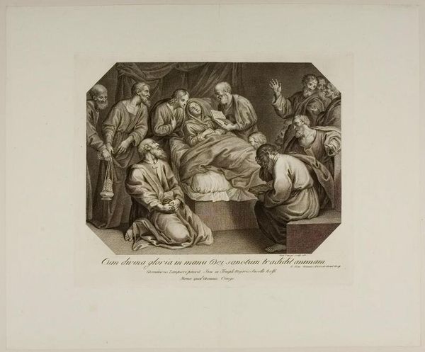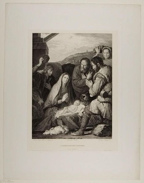 Editor: This print, titled "Holy Family with the Sleeping Christ Child" by Étienne Frédéric Lignon, feels quite intimate. It's not just a religious scene; it hints at domesticity. What do you see in this piece? Curator: I see the intersection of the sacred and the mundane, the political and the personal. The Holy Family, often idealized, is here grounded. Consider the presence of the cat—a subtle inclusion of the everyday within a scene laden with ideological weight. How does this juxtaposition challenge conventional power dynamics within religious art? Editor: That's interesting. I hadn’t considered the cat as a challenge to power, just a detail. Curator: Precisely! By humanizing this family, Lignon invites us to question the untouchable narratives of religious authority and reflect on the role of the domestic space as a site of both comfort and potential resistance. Editor: I never thought about it that way before. It's like the artist is making a statement about the humanity within the divine.