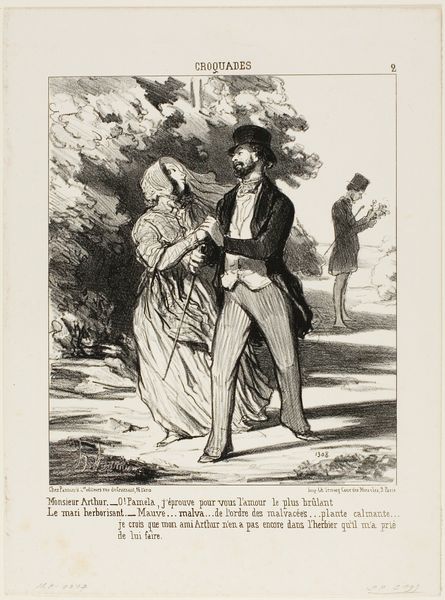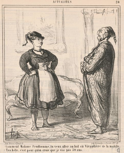 Curator: What strikes me immediately is the stark contrast in energy and expression. Editor: Indeed. We're looking at Honoré Daumier's lithograph from 1844, titled "Saperlotte!... que je voudrais... que ma femme ait fini..." or "Damn it!... How I wish... my wife would finish..." in English. It's a piece rife with social commentary, even now. Curator: Absolutely. You have a sense of the man rushing, hunched over, weighed down maybe by expectations. And then the wife stands serenely, or perhaps obliviously, reading, bathed in what seems like calm light. The implied labor on one side and leisure on the other jumps out at you. Editor: Consider Daumier’s use of lithography itself here. A relatively accessible printmaking technique for the time, it allowed his social critique to reach a wider audience. This work and its caption place a domestic pressure – a wife taking her time reading while her husband anticipates or provides, maybe through financial toil. Curator: The male figure almost seems comical in his harried state and his clothing, while the female figure embodies that rigid, ideal beauty of the era. The work critiques the socially constructed roles, right? Highlighting the disparity in how labor and leisure were distributed, specifically along gender lines. Editor: I'd add how Daumier contrasts the texture to make that distinction sharper: his hurried lines render the man, with tight, crosshatched lines suggesting the anxiety etched in the lines of his figure and garment; conversely, her form is flowing, rounded. Curator: Right! She's static, smoothed and highlighted—maybe even unaware or uncaring of the contrast that is literally created on this sheet of paper. What's interesting is thinking about how this domestic tension is not locked in time. Editor: These images of societal frictions, captured through accessible materials, were intended to reach an audience and inspire conversations – a role I still believe art must perform. It uses these class and gender dynamics we're discussing as a material – not unlike ink – for building the overall picture. Curator: Yes. Ultimately it serves as a visual tool that encourages us to question entrenched power structures and expectations, while understanding the impact on the labor force across race, class and gender. Editor: This work makes clear the important work that lies in making as it does viewing—asking those tough questions, even if the ink is only grayscale.