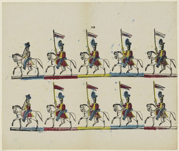 Curator: Here we have "Lanciers," a lithograph print created sometime between 1833 and 1911 by Brepols & Dierckx zoon, currently held in the collection of the Rijksmuseum. Editor: It’s whimsical, like illustrations from a children's storybook! The horses are almost pink, and those lancer uniforms practically shout with their yellow and blue. It's cheerful, but with a touch of military formality. Curator: Absolutely. It is interesting to note the lithographic process; it democratized printmaking, making images more widely accessible, and was employed for these sorts of commercial prints depicting fashion, military uniforms, and other scenes from daily life, for consumption by the burgeoning middle classes. Editor: You can almost smell the printer's ink and feel the texture of the paper. There's a repetition to it as well with the arrangement; I see how each figure, frozen in these almost cartoonish poses, tells a bit of a different story or highlights different aspects of the Lancers’ appearance, maybe for identification. It is sort of an early “spotter’s guide.” Curator: Precisely. These kinds of prints had significant commercial value as reference material. Note, too, the almost mass-produced feel created by the flat colors and limited shading. The lithographic process allowed for quicker reproduction at a lower cost, directly appealing to emerging consumer markets. Editor: And you feel that with the repetition—they're not individual portraits, they're components, almost like pieces in a set, which kind of pulls me out of Romanticism and plants my feet more in a consumerist world that would come. Curator: Exactly. Romanticism still informs the aesthetic in ways, of course; there's a genre-painting aspect in how it evokes military themes, however. But this ultimately points toward mass consumption; what at first appears individual or unique gets repeated into almost a collectible product, or at least, a reproducible artifact. Editor: A bit sad to think about that loss of the original, even. Still, they look like toy soldiers, each with their miniature world of possibilities! Curator: Indeed. That blending of function, utility, artistry, and consumption really shapes our perspective. Editor: I feel almost as though it's teaching me to observe these historical figures in new ways, recognizing they weren’t untouchable.
