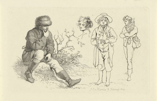 Jacob Ernst Marcus created this study sheet with seated figures and boats in the background in November 1809. Note how the seated figures are captured in moments of repose, a timeless motif echoing back to classical antiquity, where philosophers and poets were often depicted in similar contemplative poses. Consider the weight of the head resting on the hand, a gesture of introspection found across cultures and epochs, from melancholic depictions of biblical figures to modern portraiture. This gesture serves as a powerful visual shortcut, conveying profound thought and emotional depth. Like the ancient Greeks, we subconsciously imbue such gestures with meaning, a testament to our shared psychological heritage. Each line etched by Marcus resonates with this deeper human connection, engaging us in a silent dialogue across centuries. The cyclical return of these poses in art speaks to our collective memory, constantly seeking to rediscover and reinterpret fundamental human experiences.