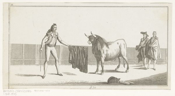 Curator: Looking at this etching from after 1790, entitled "Picador steekt zijn lans in een stier" we see a bullfighting scene. What’s your initial impression? Editor: The drama feels a bit... staged? Like a dance of power more than a truly spontaneous clash. It seems carefully orchestrated, perhaps even a touch cruel. Curator: Interesting observation. Etchings like this, particularly from this period, offer insight into how printmaking disseminated imagery of popular entertainment. We see a focus on the line, achieved through the etching process. The labor of the printmaker is quite visible, even though it’s an anonymous work. It also raises questions about consumption of these spectacles and their reflection on social structures. Editor: The bullfighting itself is a potent symbol. The bull often embodies brute strength, primal instincts, and untamed nature, while the picador, mounted on his horse, and the other figure represents intelligence and civilization’s attempts to dominate such raw forces. Doesn't it say a lot about our relationship with the natural world? Curator: It’s all performative though. The class and material divide are hard to ignore. The Picador's position, elevated on horseback and adorned with distinct attire, represents the social hierarchies at play. Meanwhile the etching itself as a reproducible medium made art more accessible. But it would still appeal mostly to a specific segment of society: those who could afford prints. Editor: Definitely, I am also wondering how people at the time understood the image of the bull in the work. Was the bull purely a representation of an aggressive creature or was it loaded with additional symbolic weight in relation to ideas circulating at the time? Curator: Considering the cultural context of the time, these etchings may have served multiple functions beyond documentation: advertisement, perhaps propaganda, glorifying a certain lifestyle or simply responding to an appetite for visual drama. Editor: Ultimately, the images have remained potent even for those disconnected from its original context, proving how images can accumulate layer upon layer of symbolism. Curator: It’s amazing how looking at the medium can open the entire process of its consumption up. The cultural history within its physical production. Editor: Indeed, contemplating the layers of meaning embedded in something seemingly straightforward has changed my understanding.
