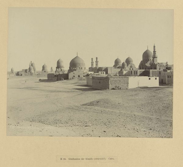 Curator: This is Maxime Du Camp's "Vue générale de la Mosquée et du Tombeau de Sultan Bezkouk, El-Melek-el-Dâher, au Kaire," a daguerreotype from around 1850, currently housed at the Metropolitan Museum of Art. Editor: It has such a somber feel, doesn't it? The muted tones, the stark composition—it evokes a sense of timelessness and a certain austerity. The domed structure really anchors the visual weight. Curator: Indeed. The artist employs a clear foreground, middle ground, and background to guide the viewer's eye. Consider the precise lines of the architecture itself. The minarets especially exemplify a kind of divine reaching. Editor: Precisely, that reaching hints at the immense labor embedded in the materials. The way it captures the rough texture of the stone hints at the sheer manpower needed to build a structure of that scale and also the time it would take. It must have been an act of devotion and resource mobilization on an almost incomprehensible scale! Curator: Absolutely. The light and shadow play an important role. Note how it delineates form, accentuating the geometric purity of the structure. This enhances the visual harmony and directs the gaze through distinct zones of light and dark. This play reinforces an ideal, maybe the one that drove the design and construction. Editor: But the image itself, as a material object, offers a tangible connection to that distant labor. Consider what would have been involved. The early photographic process involved dangerous chemicals; transporting such materials to Egypt would be itself an act of commitment! Curator: Du Camp uses a structured organization that underscores the timeless quality. The interplay of shapes—domes, minarets, arches—create rhythm, offering visual coherence and the enduring sacred. Editor: Thinking of that journey and that early practice helps one meditate on its creation. From a materials perspective, photography democratizes art, potentially challenging traditional art forms dominated by wealthy patrons commissioning unique works from select artists. Now there are accessible images available for wider audiences. Curator: Yes, through its visual balance, the Daguerrotype conveys symbolic value. Editor: It provides a crucial artifact offering a new perspective. The architecture represents skill and dedication; that must resonate regardless of the viewer's culture. Curator: Seeing that symmetry and understanding its purpose certainly gave me insight. Editor: And the knowledge of its painstaking creation allows one to better value the whole piece!