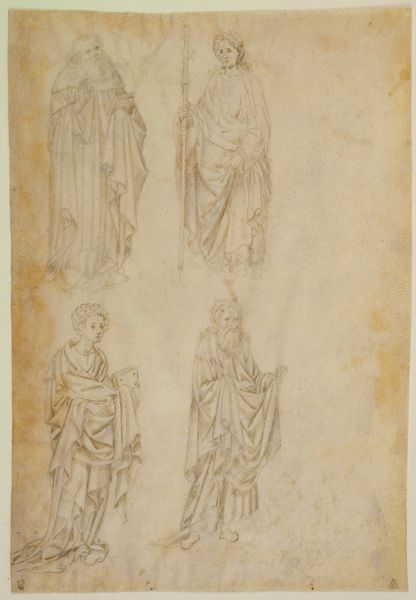 Curator: These are two panels sketched by Pellegrino Tibaldi around 1545-1550, both titled "Standing Prophet or Apostle," held here in the Art Institute of Chicago. They're rendered in chalk and charcoal. What do you make of them? Editor: Melancholy. They exude such quiet solemnity. The heavy robes, the veiled figure, the gaze turned inward. It speaks volumes, doesn’t it, about power, religion, but also… vulnerability. Curator: Absolutely, they almost hum with that energy. Tibaldi was known for his Mannerist style, and you see that here in the exaggerated musculature and elongated forms. They're biblical figures, no doubt, but there's also something intensely human about them. I feel their weight, their worries, their wisdom perhaps, etched in the charcoal lines. It’s like looking into a mirror. Editor: And what do you suppose those worries entailed? Considering the turbulent times, with the Reformation and religious wars raging, how might that context have influenced Tibaldi's hand? Were these figures conceived as pillars of strength or rather emblems of a crumbling old order? Curator: Hmmm, interesting point! It does push us to wonder if Tibaldi was hinting at anxieties bubbling under the surface, maybe not in full rebellion, but something more subtle. The church was his great patron, and still… Perhaps they speak of questioning, faith strained by the chaos around them. Look how the first Apostle hides half his face with one hand. Editor: A gesture that perhaps implies shame? Perhaps he’s covering his face as a result of internal conflict, his position of authority being at odds with a message of morality. What do you think the purpose of producing the works as two halves was? Curator: Interesting question… maybe to express an unspoken tension or a duality inherent within belief systems themselves. Tibaldi's “Standing Prophet or Apostle” is not just religious portraiture but seems deeply embedded in complex societal shifts. Perhaps the pair also symbolizes contrasting paths or choices... Either one is fine as long as they allow space for contemplation and introspection. Editor: The rendering in charcoal and chalk contributes to that effect—ethereal and earthly. Curator: Indeed. It's rare to glimpse the uncertainty behind grand pronouncements. These prophets seem more human than divine, almost undone by what they have witnessed. Editor: Ultimately, the drawings are evidence of human struggle within the confines of institutional authority and offer more insight into an ongoing conflict between power and vulnerability. Thank you for offering such illuminating perspectives today. Curator: A privilege, indeed. Thank you for giving them further context. It allows for an enriching artistic experience for every visitor to the museum!