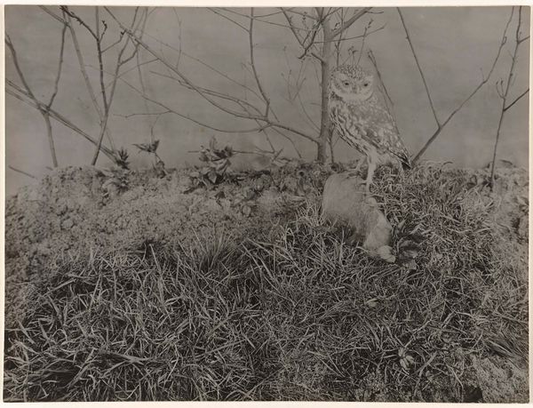 Curator: Here we have a gelatin-silver print titled "Drie jonge tureluurs op hun nest (vogels)," or "Three young redshanks on their nest (birds)," by Richard Tepe. It was taken sometime between 1900 and 1930. Editor: It's so delicate. A real sense of vulnerability, seeing these tiny birds huddled together in their nest. The monochromatic tones amplify that fragility, almost like a forgotten memory. Curator: Indeed. Tepe, though considered an amateur photographer, worked with an impressive dedication to documenting nature, which during this period required considerable labor in both accessing and recording his subjects. This dedication suggests a social context increasingly valuing both naturalism and the ability for middle-class citizens to engage in scientific pursuits. Editor: I get that. The texture is fantastic; it feels almost tangible. You can practically feel the softness of the downy feathers and the dryness of the grass blades surrounding them. Makes you want to protect them. Curator: And the choice of gelatin silver as the print medium also speaks to something about mass reproducibility in image making. It was a relatively accessible process that still imbued the final work with an aura of meticulous craft, allowing this nature photography to gain widespread distribution and influence public perceptions about wildlife. Editor: Absolutely. It’s amazing how such a still, quiet image can feel so alive. Like you’ve stumbled upon a secret little world hidden away in the tall grass. Curator: Precisely. The work encourages our inspection into the means and circumstances around photography as both material craft and documentary record. Editor: Yes, and what really resonates for me is that whisper of maternal comfort. Tepe’s photo captures not just a scientific observation but an emotional bond with nature. Curator: A fascinating, almost tender consideration for subjects we might typically overlook. Editor: Exactly. It reminds me to seek out and protect the fleeting beauties in our surroundings.