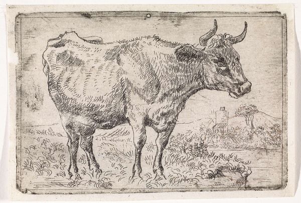 Curator: Cornelis Ploos van Amstel created this image, titled "A Steer," sometime around the 18th century. It resides here at the Harvard Art Museums. Editor: My first thought is that it’s an image of weary subjugation; the steer seems tired, its head low, perhaps burdened by its role. Curator: The cultural symbolism of cattle has long been intertwined with power dynamics, hasn't it? Consider its use in agriculture, its economic value. We can view this through the lens of labor and exploitation. Editor: Indeed. Cattle have been symbols of prosperity and servitude. The image itself carries a certain weight, a somber quality, enhanced by the stark lines and shading. It seems to echo humanity's complex relationship with the animal kingdom. Curator: Perhaps this image asks us to consider animal rights, or lack thereof, historically, and in our contemporary world. Editor: Ultimately, it’s a poignant reflection on our intertwined destinies. Curator: I agree. A sober reminder indeed.