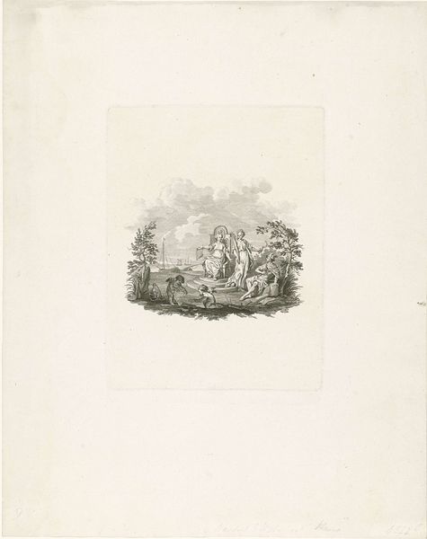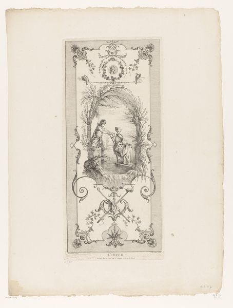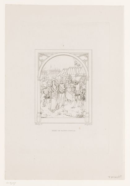 Curator: This print by Charles Gavard, dating from between 1835 and 1871, depicts "The Taking of Stralsund, 1807," now held at the Rijksmuseum. What is your immediate reaction to this print? Editor: It strikes me as remarkably delicate, almost ethereal. The muted tones of the aged paper, combined with the fine lines of the engraving, create a sense of distance, both temporal and emotional. The figures seem caught in a moment both grand and fleeting. Curator: Yes, that distance is interesting. The event, the siege of Stralsund by Napoleon's forces, was quite brutal. Gavard, though, frames the historical narrative within an elaborate, decorative border, almost like a memory carefully preserved, softened by time. Editor: The border certainly plays an important role. Its ornamental nature contrasts sharply with the depiction of warfare within. Semiotically, it acts as a distancing mechanism, a way to contain and perhaps even aestheticize the violence. Curator: I see the border as symbolic, reflecting how history itself is often framed, curated, and sometimes even romanticized. Notice the subdued palette? There is very little tonal variation in the image which emphasizes how memories fade over time. It also speaks to cultural memory and how societies selectively remember and present their histories. Editor: Formally, the artist uses a fairly high vantage point, offering a comprehensive, almost detached view of the scene. The linear perspective guides the eye deep into the composition, creating depth despite the limited tonal range. Curator: Consider how academic art traditions can also create distance between a subject and a work’s impact or influence. Academic approaches create space and a specific frame for something, like Gavard’s print and a historical event. Do you think that dilutes a piece or makes its statements more profound? Editor: I would say the effect is more akin to an obscuration – the medium mediates the message and our viewing experience in perpetuity. And as time passes, its affect only solidifies. Thank you for your insight into this layered work! Curator: Thank you; I will contemplate how historical depictions continue to hold a place in contemporary discourse!