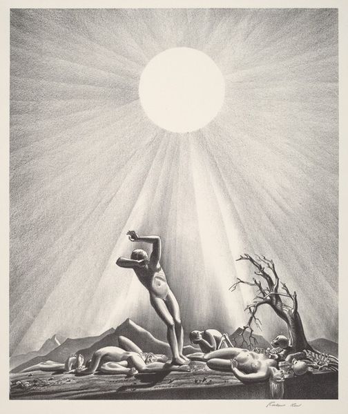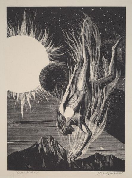 Rockwell Kent made this lithograph titled 'Degravitation', its date is unknown. Kent was a socialist, and this print embodies a utopian desire to escape the strictures of modern life. The figures rising above the city suggest a rejection of urban existence, the constraints of capitalism, or perhaps even the laws of physics. Made in the United States, the print reflects early twentieth-century anxieties about industrialization and alienation. The imagery taps into socialist ideals and the pursuit of individual freedom. Kent’s work often incorporates themes of social justice and critiques of capitalist society. In this context, 'Degravitation' can be seen as a commentary on the oppressive structures of his time. To truly understand this work, it’s helpful to research the political climate and artistic movements, such as the Ashcan School. By examining these socio-political influences, we can better understand how art reflects, and also challenges, the norms of its time.