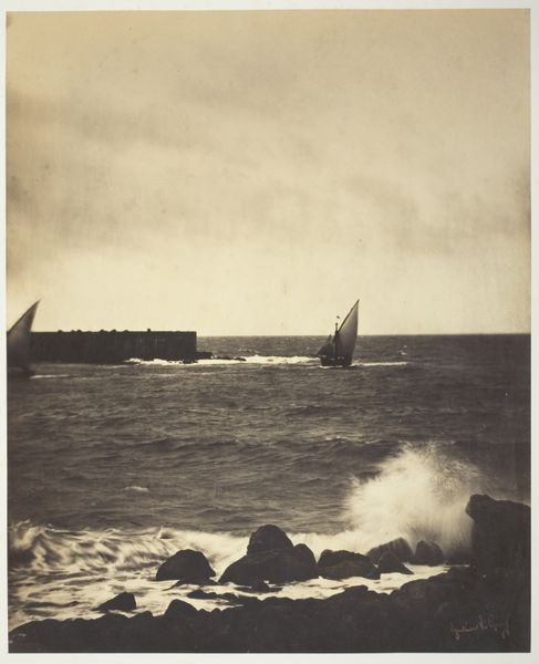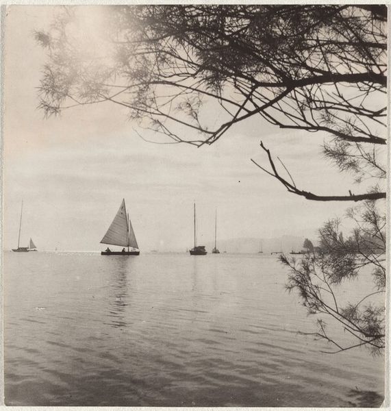 Curator: The work before us, "A Suffolk Shrimper 'Coming Ashore'", a photograph by Peter Henry Emerson, dates from around 1883 to 1888. It's a gelatin silver print currently held in the Art Institute of Chicago. Editor: It’s…peaceful. Melancholy, almost. The muted tones and the solitary boat heading toward shore evoke a sense of quiet labor, of returning after a long day's work. It’s compelling in its simplicity. Curator: Emerson aimed for photographic naturalism, pushing against staged, pictorialist approaches popular at the time. He sought to capture scenes of rural life authentically. This piece resonates with broader narratives around labor, class, and the representation of marginalized communities in late 19th-century England. How does Emerson's realism affect your reading? Editor: Knowing his intentions adds another layer. It reframes what I see: no longer just a picturesque seascape but a social document. The shrimper’s labor is present, their class is visible – though the framing keeps us at a respectful distance. It asks the viewer to consider these lives not as an exotic scene, but within their daily context. I can't help but question the potential romanticization, the lens through which this image reaches an audience. Curator: Exactly. There is the complexity that surfaces when we consider how class, gender, and even colonialism are operating within the gaze. What political work does an image like this perform? We should investigate whether it perpetuates certain stereotypes of rural life or perhaps even challenges prevailing urban, bourgeois perspectives. Editor: Absolutely, and it's also relevant to investigate what the image does for and to us today. Thinking about our present historical moment—with concerns around the ecological impact of the fishing industry and sustainability, these images open to a critical lens on exploitation and class struggle. Curator: It highlights the continuous interplay of past and present. Our perspectives inevitably shape our interpretation of it. What lasting impression do you think "A Suffolk Shrimper" leaves us with? Editor: Perhaps it serves as a reminder that art doesn’t exist in a vacuum; that social contexts and contemporary theories shape our understanding. Emerson's image compels us to negotiate history, aesthetics, and our place within these narratives. Curator: Indeed, a potent reminder of how photography functions within complex social structures and how it offers a unique perspective.