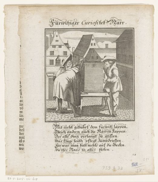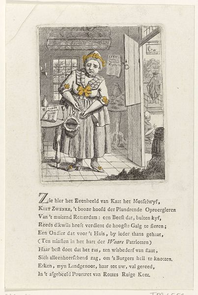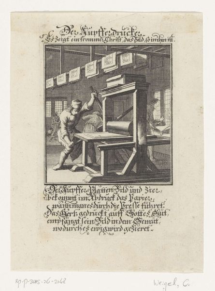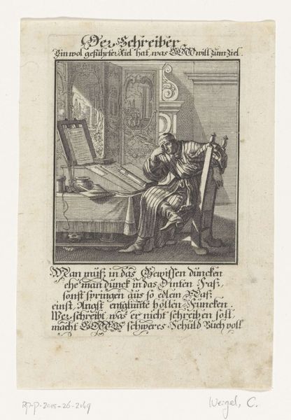 Editor: Here we have "Schilder aan het werk in zijn atelier," or "Painter at work in his studio," an engraving from 1758 now at the Rijksmuseum, by an anonymous artist. It strikes me as incredibly meta – a picture of someone making a picture. What catches your eye when you look at this piece? Curator: Oh, it’s more than meta; it's a delicious reflection on creation itself! Look how the artist has situated their subject within the act of making. There’s a quiet intensity, wouldn’t you agree? Editor: Absolutely, the light seems very focused on the canvas itself. Curator: Precisely! The artist’s world seems contained by their studio; all of the visible action is about building a picture from scratch, imbuing a sense of dedication but perhaps also an intellectual bubble. Do you notice any particular objects or details that feel significant to you? Editor: I like the glimpses we get into the next room with the group of people in conversation, as well as the various art pieces strewn around the studio. Curator: Ah, the little pocket universes that the painter probably envisions and creates with passion every day. This almost hints at a conversation about art's function – the active engagement with the outside world (through subjects) on the one hand, and internal creative dialogue on the other. There is certainly some playful duality at work here, it almost makes you feel like you’re experiencing two worlds simultaneously. Editor: It makes you wonder, too, what the painting within the painting looks like, and what conversations it hopes to inspire! Curator: Beautifully put. It becomes a layered investigation of making and meaning that transcends its baroque aesthetic.