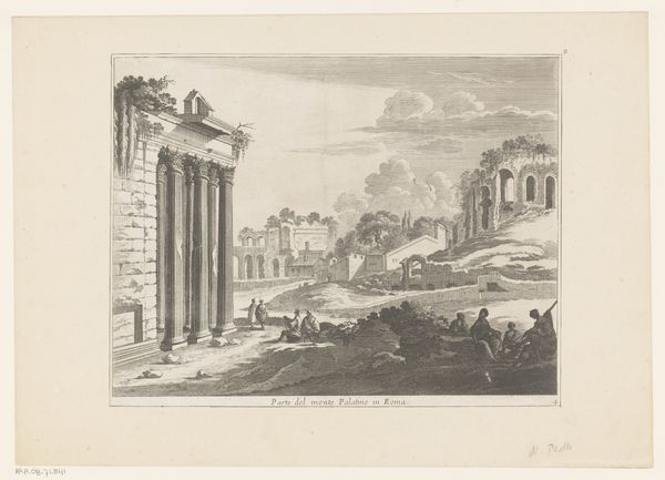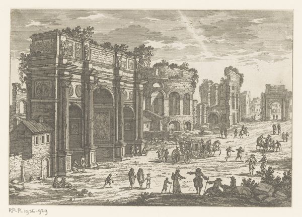 Curator: Here we have "Figuren temidden van Romeinse ruïnes," or "Figures Amidst Roman Ruins," potentially dating back to 1749, attributed to Paul Angier, here at the Rijksmuseum. It’s an engraving. What's your immediate take? Editor: There’s a quiet grandeur to it, a ghostly stillness. It feels less like a depiction of specific ruins and more like a stage set. Curator: Angier, known primarily as an engraver, was instrumental in popularizing architectural views and capriccios during a period of intense interest in classical antiquity. Consider the timing; mid-18th century. Excavations at Herculaneum and Pompeii had sparked a continent-wide Roman fever. Editor: "Roman fever"—love it! I imagine Angier, pen in hand, surrounded by dog-eared texts, trying to piece together a vanished world. It’s less about architectural accuracy, I think, and more about conjuring a feeling. Look at the figures in the foreground – they seem dwarfed, almost incidental, in the face of these looming remains. They highlight the ephemeral nature of existence versus the endurance of stone, albeit crumbling stone. Curator: Exactly. This interplay of time, and how ruins can serve as a memento mori, reflecting on mortality and the transience of power is critical here. He's tapping into that familiar melancholic fascination, also offering subtle commentary on empire itself. Editor: It almost feels theatrical—these aren't just passive viewers. They seem to be actively engaging with the past. The very notion that all civilizations eventually become ruins themselves… gives me chills! I am now wondering about my own impermanence in the timeline of the universe! Curator: Well put. His choice of engraving as a medium is particularly savvy here too; allowing mass production, and broad dissemination. Angier democratized access to these visions, fueling, and feeding Europe’s collective imagination. Editor: Knowing the intention behind making art sometimes demystifies the experience, however I can agree about its emotional intention being well delivered in that case! It definitely has inspired thought and reflection here for me too. Curator: Agreed! Angier offers not just a view of the ruins, but of our complex relationship to history itself, the eternal push and pull between destruction and beauty. Editor: Beautifully said. The work is ultimately a meditation on the cycle of rise and fall. We get a clear impression about past and present existing in a perpetual dance with one another.