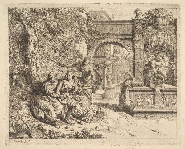 Johann Oswald Harms created this etching, "Landscape with antique ruins and figures by a fountain," around the turn of the 18th century. Etching involves covering a metal plate with a waxy, acid-resistant substance, then scratching an image into it. When acid is applied, it bites into the exposed metal, creating lines that hold ink. Notice the artist's skilled use of line. Look closely, and you can discern how line density creates areas of light and shadow, lending depth to the ruins and figures. This print is a testament to the engraver's craft, where precision and control are paramount. The process allowed for the relatively quick reproduction of images, making art more accessible. Harms’s delicate lines transform the hard metal into a scene suffused with light and atmosphere. The ruins themselves speak to the passage of time, a poignant commentary on the transience of human endeavor. By appreciating the labor and the materials involved, we can see how "fine" art is also deeply connected to craft.