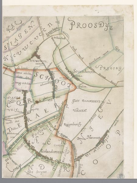 Curator: Oh, this whispers tales of bygone days! Looking at it now, this fragment seems like a memory half-remembered, wouldn’t you say? I feel a soft sort of wonder gazing at it. Editor: It's fascinating to consider how maps can tell us so much more than just geographical data. Here we have "Deel van een kaart van het Hoogheemraadschap van Rijnland, met Noorden en omgeving," which translates to "Part of a map of the High Water Board of Rijnland, with Noorden and surroundings." It was drawn in 1615 by Floris Balthasarsz van Berckenrode and made using etching, ink, and paper. It's a geographical, and, of course, a political document. Curator: A political document! Oh, absolutely! It feels almost subversive in a quiet way, like it holds secret strategies tucked into the neat little lines, don’t you think? Seeing all these defined boundaries gives off this feeling of power—almost tangible on the page! Editor: Right! This wasn't just about showing where things were; it was about claiming authority over the land. Rijnland was—and is—a region constantly battling the threat of water. A detailed map like this would be crucial for water management, taxation, and even military planning. And look how clearly the waterways are etched. Curator: Yes, almost alive—those watercourses have a fluidity to them! Imagine tracing them with your fingertips, the ink cool beneath your hand. In a way, aren’t we all trying to map out our lives, draw our own boundaries? Editor: Indeed. And notice how the typography varies; the lettering conveys a hierarchy of settlements and areas of jurisdiction, all carefully planned to assert the dominance of Rijnland's administrative power during a period when the Dutch Republic was asserting its own identity and sovereignty. Maps like these served to impress upon people both local and foreign, the scope and mastery the Dutch had over their territory. Curator: Like claiming a narrative! A story written with lines and ink. Doesn't it give you a yearning for that time? The precision… but also, that beautiful handmade quality. Editor: Exactly, but, let's also not forget how cartography participated in some of the power dynamics of that time, in an early form of surveillance or data collection, even. But there is something deeply captivating, perhaps especially now in our digital age, about such hand-crafted documents. Curator: Perhaps that's what captivates me... in our age of the pixel, something drawn by human hands feels nothing short of magical. Editor: So true. Thinking about it this way adds layers to appreciating not just the craft but its historical relevance.