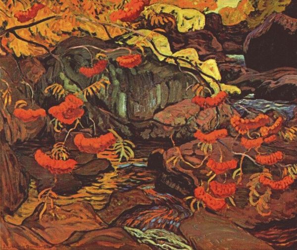 Curator: Well, this artwork certainly makes a bold statement. The piece is called “Vladimir campaign to Korsun (Red Sails)", painted by Nicholas Roerich in 1900. It's an oil on canvas and currently hangs in the Tretyakov Gallery in Moscow. What strikes you first about it? Editor: Honestly, the red! It’s so saturated, almost alarmingly joyful against that murky water. It's like blood mixed with rust, a strange pairing that suggests… ambition, maybe even recklessness, wrapped in tradition. Curator: Absolutely. Red often symbolizes power, sacrifice, and in a historical context like this, military might. It also could allude to a fiery zeal associated with conversion and religious fervor given the subject of Vladimir’s campaign which marked a pivotal moment in the Christianization of Rus. Editor: Yes, you can sense that pivotal weight. It’s not just a pretty picture of boats. Those aren’t pleasure cruises! The massed ships almost vibrate with pent-up energy. All those spear-like masts echo each other, like the breath held before a battle cry. Even those slightly drab looking figures have a threatening demeanor. Curator: Precisely! Roerich doesn't give us portraits; he gives us symbolic representation of a sweeping event. The layered approach to painting figures and objects offers this feeling of density as well. Notice, too, how the architecture in the background looks almost fragile, awaiting transformation. The high vantage point suggests a moment of transition from contemplation to action. Editor: Transition is key. It almost makes me wonder about the psychology behind these figures, about that leader... What makes someone turn the page on the religion of their ancestors for another? But red can also be joyous as well! It gives the scene almost this air of almost festive doom… which sounds terribly morbid! Curator: That tension you sense is powerful. Roerich highlights both the triumph and potential tragedy, perhaps questioning the motivations behind such monumental historical shifts. But most of all, as is custom with him, it feels reverential, if only from the grand scale of the natural and human drama displayed together in this beautiful oil. Editor: I suppose that is where the artwork’s magic lies! By capturing this moment of both personal and collective transformation. The old, the new and the glorious doom combined. All painted, of course, under a gorgeous blood red sunset.