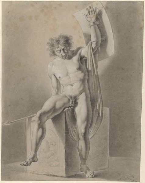 Curator: This drawing, housed here at the Harvard Art Museums, is by Washington Allston and presents a "Rear View of a Standing Nude Male with Sword and Staff." Editor: It’s arresting, this stark figure; the visible process, the slightly rough paper... there's a certain vulnerability to it. Curator: Allston, active in the early 19th century, was deeply influenced by the European masters. This sketch reveals an interest in classical forms, typical of academic art. Editor: The material itself--the graphite on paper--speaks volumes about artistic labor and the act of sketching as preparation, a far cry from the finished, idealized paintings of the time. Curator: Precisely. Allston's drawing offers a glimpse into the artistic process, and the figure's pose hints at allegorical or historical narratives popular during his time. Editor: For me, it is more about raw physicality; the sword and staff are extensions of the body, tools perhaps, but also symbols of power and control wielded by the masculine form. Curator: It underscores how the male nude has historically served as a vehicle for exploring ideals of beauty, strength, and even moral virtue, particularly within the context of Western art. Editor: Seeing the marks of creation so clearly really changes how we interpret the image itself. It brings an immediacy to something that could otherwise feel quite remote.