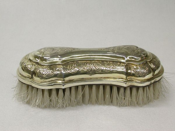 This clothes brush, one of a pair, resides at the Metropolitan Museum of Art, and was crafted by the Barnard Brothers. Notice the meticulous floral engravings which adorn the brush's silver surface, creating a dance of light and shadow. These details invite us to consider the cultural and artistic milieu in which such an object was not merely functional, but also an expression of status and aesthetic sensibility. The layering of textures, from the smooth, reflective metal to the soft bristles, speaks to a broader engagement with tactile experience and sensory pleasure. How do such material contrasts play into our understanding of luxury and refinement? The mirrored symmetry of the brushes, crowned with matching medallions, hints at the formal rituals of grooming and the performative aspects of personal presentation. Consider how this object, through its form and decoration, embodies not just utility but a complex interplay of social codes and artistic values.