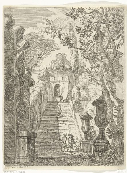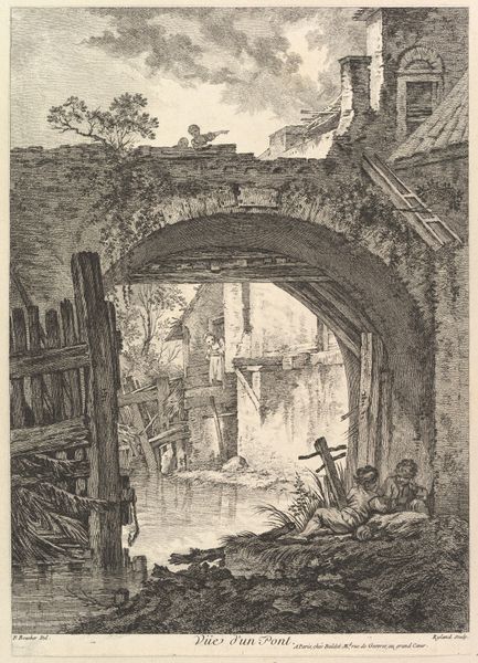 Canaletto created this print, "The Bishop's Tomb," as part of his Vedute series. The detailed etching captures a landscape populated with ruins, rendered entirely in linear strokes. These lines create texture and shadow, suggesting a melancholic atmosphere. The composition employs a stark contrast between the natural and the architectural. Notice how the skeletal tree on the left opposes the geometric precision of the ruins on the right, while the horizontal lines of the sky and the roof create a sense of depth. Canaletto masterfully uses the etching technique to evoke a sense of decay and the passage of time. The lines, though precise, carry a visual weight that speaks to the transience of human achievements against the backdrop of nature’s enduring presence. This interplay invites us to reflect on themes of memory, ruin, and the sublime.