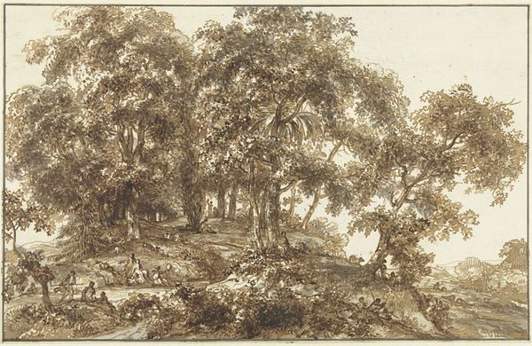 Editor: This is "Waldinneres mit Staffagefiguren," a landscape drawing and etching by Franz Kobell, made with ink on paper. It creates such a sense of depth and mystery with what seems like very few lines. How should we interpret its place in art history? Curator: What I find compelling here is the tension between nature and its cultural framing. Etchings like this, reproduced and disseminated, were instrumental in shaping popular perceptions of the ideal landscape. Notice the figures nestled almost imperceptibly within the woods. Do they strike you as truly "of" nature? Editor: No, they seem like intruders almost. Are you saying that the very act of depicting a forest changes our understanding of it? Curator: Precisely! Consider how this image might have been consumed. Was it intended to inspire awe, fear, a desire for ownership, or something else entirely? The figures give it context – almost staging it. These prints circulated amongst an emerging middle class, solidifying a certain aesthetic linked to social standing. It connects to ideas about nature as picturesque, as a site of leisure and contemplation, separate from labour. Editor: That's fascinating. I never considered how something as simple as a drawing could reinforce those kinds of social divisions. Was there resistance to that? Did all art fall into this cultural framing? Curator: Certainly not! But recognizing the powerful role these seemingly innocent landscape scenes played in constructing cultural values provides a rich way of thinking about how art functioned within its society. Art either becomes a tool to reinforce, or it’s disrupting conventions. Editor: That's a perspective I really hadn't thought about before. It's made me think a lot about not only how images impact a society, but their inherent historical function too! Curator: Indeed. Thinking critically about such works opens a pathway to considering the role that art can play in shaping cultural beliefs and hierarchies, a constant negotiation we still see today.