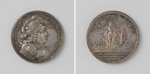 Curator: Look at this metal coin commemorating Frederick, King of Prussia, assisting the Netherlands during wartime with France; the date on this artifact is 1702. Editor: My initial response is one of stoicism. The relief of Frederick is serene. This belies the chaotic reality of the war he was wading into. Curator: I wonder about this selection of Frederick for such memorialization. What motivated Prussia's assistance? To see that through an intersectional lens would require considering power dynamics. Was it purely altruistic, or was there a desire for resources or increased political clout at play? Editor: The visual program leads us away from base political readings. The laurel wreath in his hair reminds us of the classical allusions during this period, echoing motifs of Roman emperors and signaling victory and merit. The figure on the coin's other side certainly solidifies this. Curator: On the other side, the imagery of Mars… So war itself as a figure? To embody conflict is fascinating, it serves as both legitimization of the violence and as a distancing act from the king himself. Editor: He stands stoic with two ornate pikes—I agree. The inscription surrounding Mars is clearly meant to solidify and underline the message: assistance, hope. Curator: Definitely an object designed to serve propaganda purposes in many regards—asserting not just dominance but seemingly righteous authority at a turning point in history. It forces me to consider how many hidden motivations lie beneath narratives of heroism and nationhood, Editor: Precisely! The coin feels less about historical facts, as more as something timeless: a moment of cultural memory manifested and carefully preserved. It prompts us to reflect on how we continually remake the past through carefully curated symbols. Curator: Exactly. In just this artifact, we can appreciate the nuance and the various sociopolitical motives that contributed to how an event has been rendered—an important lens for how to view all recorded "history". Editor: Absolutely; it reinforces the fact that symbolism—its use and the intent—carries legacies, echoing even into our present cultural landscape.