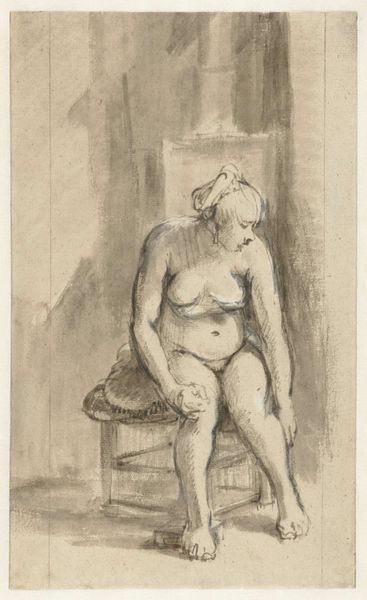 Editor: This is Aert de Gelder's "Kneeling Female Nude with Outstretched Arms," a charcoal and pencil drawing from around 1660-1662. I'm struck by the intimacy of the pose; it feels very private and vulnerable. How do you interpret this work, particularly in the context of its time? Curator: It's interesting that you pick up on that sense of intimacy. In the context of the 17th century, depictions of the nude body were often laden with allegorical or mythological meaning, which served to create a safe distance between the viewer and the subject. But Gelder’s focus here is simply on the human form, captured in a moment of quiet contemplation, or perhaps supplication. How might that defiance of genre be considered subversive, perhaps a way of claiming artistic agency for marginalized bodies? Editor: That's a really interesting point. So, it's less about idealized beauty and more about...authenticity? Curator: Precisely. Gelder, as a student of Rembrandt, would likely have seen value in representing subjects with a degree of realism, countering conventional ideals of the female form. The pose, seemingly straightforward, takes on new resonance. Are her outstretched arms a plea? An offering? How do those ambiguities engage with prevailing narratives about women? Consider also, who was this model? Did she have agency in this artistic depiction? What was her relationship to the artist and patron? Editor: I hadn't thought about those questions related to agency. It definitely makes me consider it differently, thinking about whose gaze is prioritized and what stories are not being told. Curator: Exactly. It opens up a conversation, doesn't it? Examining these absences within art history helps us understand the power structures at play. Editor: Definitely. I’ll remember that next time.
