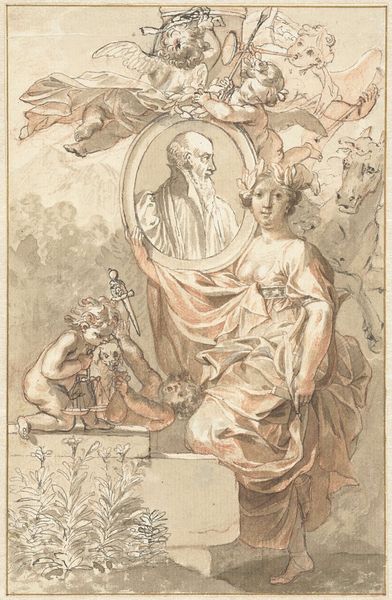 Editor: This is François Gérard's "An Allegory of Empress Josephine as Patroness of the Gardens at Malmaison," circa 1805-1806. The colors are so delicate, almost like a carefully hand-painted postcard. What grabs your attention when you look at this work? Curator: Well, considering its historical moment, the immediate thing I see is not just the romantic portrayal of Josephine, but how Gérard uses the allegory itself as a form of propaganda. Consider the industrial underpinnings necessary for the greenhouses depicted; these are monuments to consumption and a specific social order enabled by industrial materials and processes. Editor: Propaganda through horticulture, interesting! The greenhouse looks enormous, almost like a factory... Curator: Exactly! And the depiction of Josephine in classical garb, placing a wreath on her own bust – it all contributes to the construction of an image. The labor involved in building and maintaining the gardens, sourcing the materials for the building, even the creation of the watercolor itself, all point to systems of power and production. Don’t you find the contrast between the delicacy of the watercolor medium and the grandness of the message quite telling? Editor: I do, especially with the framed birds and fountains to either side, reinforcing control over nature itself as a form of power. How different is this compared to, say, art created using oil painting at that time? Curator: It’s a matter of scale, and perceived value. Watercolors were often seen as studies, less serious endeavors. By using watercolor, Gérard almost domesticates the grand allegory, linking Josephine's patronage with accessible and widely-consumed imagery. It blurs the lines between 'high' art and the consumable world of prints and decor. Editor: That makes so much sense! Thinking about it now, the mass production of prints after this piece allowed it to spread an idealized view of Josephine to a much wider audience. Curator: Precisely. And that widespread image, that’s where its power truly resided. Now, next time you see an idyllic scene, think about the materials, the labor, and the social machinery that brings it into being. Editor: I will definitely see landscapes with new eyes. Thanks for unraveling the many layers embedded within this one!