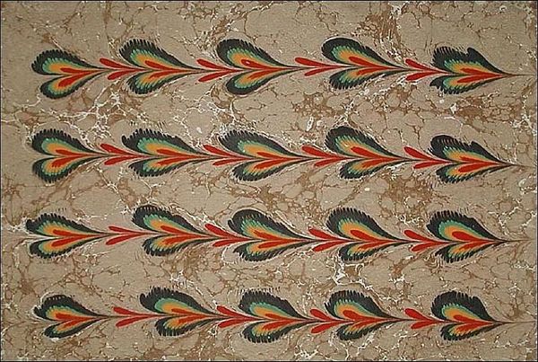 This is a marbling work titled 'Hatip Ebru' by Mustafa Duzgunman, an artist who lived in Turkey and died in 1990. Ebru is the traditional Turkish art of paper marbling, creating colorful patterns by floating pigments on water and then transferring them to paper. Duzgunman's piece reflects the cultural and religious heritage of Turkey, where Ebru art has been historically associated with Sufism and used in calligraphy and bookbinding. The repeated motifs in this artwork are reminiscent of Ottoman decorative patterns, reflecting the conservative aesthetics that persisted in Turkish art even into the 20th century. Marbling also became institutionalized as a craft taught in schools and workshops, supporting its continuation as a national art form. As art historians, our interpretation of Ebru involves understanding not just its aesthetic qualities but also its significance within Turkish cultural, religious, and institutional history. By exploring these connections, we gain insights into the complex interplay between art and society.