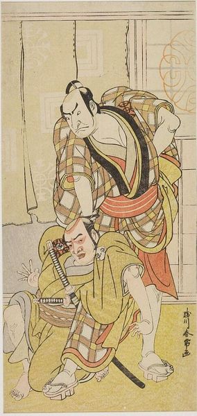 This woodblock print by Katsukawa Shunshō captures a scene from a Kabuki play performed in 1783. The work presents two actors in what appears to be a moment of high drama, rendered with a striking use of line and pattern. Notice how Shunshō employs bold outlines to define the figures, contrasting the flat planes of their costumes with the expressiveness of their faces. The plaid patterns of their robes create a complex visual texture, a kind of semiotic code signalling character status and role. These patterns clash and harmonize, reflecting the tensions within the scene. The composition is carefully constructed. The positioning of the actors, one kneeling with a sword and the other looming above, suggests a narrative of power and conflict. Shunshō uses the spatial arrangement to enhance the dramatic impact, inviting us to decode the relationships and meanings embedded within this dynamic configuration. The print challenges fixed meanings by capturing the fluid and performative nature of identity.