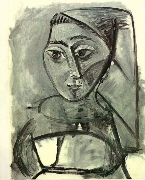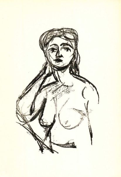 Editor: This is Leonard McComb's "Jenny Scott", from the Tate collection. The stark black and white is so striking, and I'm curious, what stands out to you about this piece? Curator: I'm drawn to the way McComb positions Jenny within the broader social conversation around representation. How does this image, with its raw strokes and unconventional composition, challenge traditional portraiture and its power dynamics? Editor: That's interesting. I hadn't considered it in that way before. Curator: Consider how the dark background emphasizes the sitter's presence, and the visibility of her chest. Does this suggest vulnerability? What kind of agency does Jenny have in this depiction, and what does that say about McComb’s own view? Editor: It's really about power. I guess I was just seeing a portrait. Thanks, that’s given me a whole new perspective.