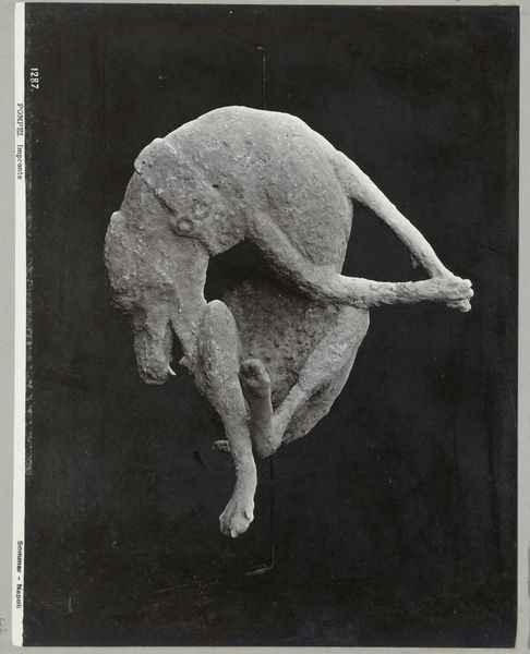 Curator: This striking piece is entitled "Derwisz," an assemblage created around 1960 by Alina Szapocznikow. Its textured surfaces and the interplay of dense matter with slender linear elements are immediately compelling. Editor: It gives me a somber impression. The monochrome palette certainly contributes to that, as do those dark, almost tormented-looking forms rising on what appears to be two very precarious supports. There is some element of brutality, isn’t there? Curator: In some ways, yes. Szapocznikow's practice, particularly in this period, engaged with the body, not in celebration, but in the face of mortality and trauma. She often explored how we grapple with the body’s fragility, which was influenced by her experiences as a Holocaust survivor. Editor: The title, “Derwisz,” connects it to a specific cultural and perhaps spiritual practice – that of the whirling dervishes who perform a Sufi dance as a form of worship. What is that link? Curator: Dervishes seek a kind of ecstatic union, transcendence through movement. Perhaps Szapocznikow saw something in their practice that echoed her own struggles: the attempt to move beyond, or perhaps transform, the suffering she experienced. Consider the form itself - seemingly fixed, monumental, yet simultaneously fragile. Editor: So it’s about finding some kind of release? Despite its oppressive character and weighty matter, I keep coming back to its title. Does its form give visual expression to whirling? The sculpture certainly embodies movement in spite of its rigid composure and the heavy darkness of its physical components. Curator: The sculpture embodies contradictions. Szapocznikow forces us to reconcile apparent opposites, reflecting, I think, a profound aspect of the human condition. It reminds me how historical forces can be reflected and refracted through cultural symbols. Editor: For me, that tension between movement and stillness really opens up an interpretation beyond the obvious trauma and towards the possibility of resistance, both physical and spiritual. The fact that something so monumental looks to be almost defying gravity fascinates me most. Curator: Indeed, its evocative power is undeniable, even decades later. Its unsettling beauty really urges one to remember the individual experience as inextricably entwined with greater social forces.