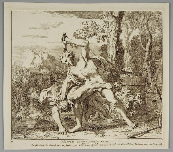 Curator: The sheer intensity captured in this ink drawing is immediately striking. The bodies are so entwined it’s initially hard to separate them, and the act of violence feels incredibly immediate. Editor: Indeed. What we're seeing here is "Kaïn Doodt Abel," or "Cain Slaying Abel" in English, by Gerard de Lairesse, dating back to 1665. The work is currently held at the Rijksmuseum. It is fascinating to see such a fundamental and violent act rendered in delicate ink lines. Curator: The rendering is brutal. Note how the positioning evokes classical sculptures, yet the sheer, raw violence is almost unsettling. This struggle visualized—it points towards a fundamental disruption in societal order, and the origin of patriarchal violence. Editor: It is visually unsettling. Cain towering over Abel, weapon raised—it's a composition that taps into something primordial. This image of fratricide reverberates through time, speaking to themes of jealousy, sacrifice, and divine favor. Curator: Right—divine favor assigned in ways that serve no sense of rational human values or justice! In some ways, Abel's unearned acceptance becomes a kind of systemic endorsement, enabling his power while simultaneously provoking Cain. That is also an age-old theme of power relations that we see reenacted over and over again. Editor: Exactly. And see how the landscape itself almost seems to recoil from the act, even the trees are gnarled and twisted. It’s as if the artist intends for us to not only witness the act, but the moment when that very first irrevocable transgression occurs. Curator: Perhaps a representation of patriarchal entitlement—the violence inherent when such entitlement goes unchallenged and the power dynamic leads to abuse and internal strife. It serves as a chilling reminder of the destructive nature of unchecked male aggression. Editor: It underscores the dangers of unchecked rage and its long lasting consequences—represented here by how that single spark reverberates throughout human history in religious, political, and philosophical thought. Curator: Absolutely, leaving us to ponder our interpretations, but more significantly the very real, felt impact of violence both represented and internalized. Editor: Indeed. A complex rendering of an event and its reverberations on so many different levels, that we continue to unpack.