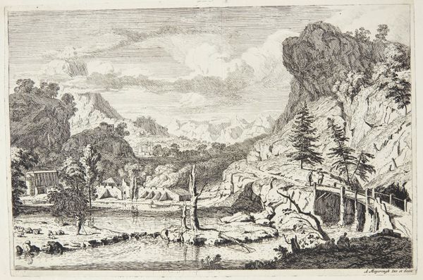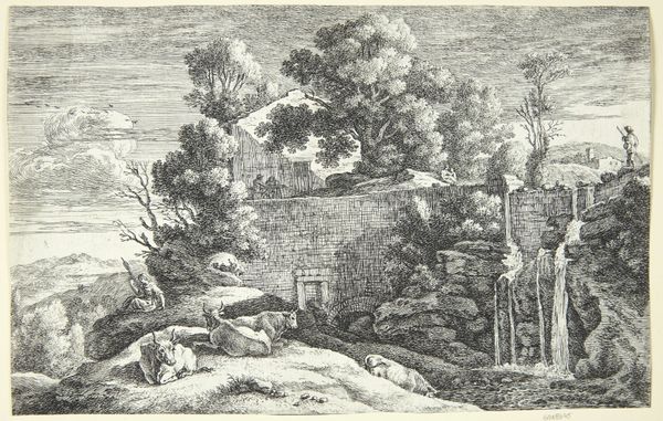 Curator: The work before us is “Fløjtespillende hyrde ved et monument,” or “Flute-Playing Shepherd by a Monument,” created by Albert Meyering sometime between 1645 and 1714. Executed in etching, it embodies the Baroque aesthetic with a pastoral sensibility. Editor: My first impression is one of subdued melancholy. The light seems filtered, and even though it depicts an outdoor scene, it evokes a certain inward contemplation, perhaps because of the delicate, almost hesitant, linework. Curator: Absolutely. The pastoral scene—the shepherd, the grazing animals—conjures classical ideals of leisure and harmony with nature. But, as the title suggests, there's that prominent monument, which casts a shadow, both literally and metaphorically, across the image. Editor: The monument is strategically placed on the left, acting as a compositional anchor. Note how the eye is drawn from the detailed foreground, with its textured earth, up to the smooth surface of the monument, before drifting into the less-defined landscape beyond. Curator: Right. The monument itself becomes a symbol of time, memory, even mortality, doesn't it? The shepherd's flute music, traditionally associated with idyllic pleasure, is here juxtaposed with this imposing reminder of human impermanence. One must wonder about its specific placement within this vista, a statement perhaps on how time treats even nature. Editor: The monument, with its decorative urn, might be an allusion to vanitas, or the transience of life. We have these layers of symbolic encoding at play here. Furthermore, Meyering uses the etching medium to create subtle gradations of tone, intensifying the scene’s evocative nature. Curator: I agree. This work demonstrates the Baroque love of layered meaning. The etching medium, with its fine lines and subtle shading, also invites close contemplation, prompting viewers to decode its cultural and historical resonances. It calls to mind the ongoing cycle of civilization. Editor: For me, Meyering’s skillful arrangement of forms and tonal balance in this piece underscores the importance of recognizing the complex interplay between the objective reality and subjective perception, or the power that subtle gradations offer the final image. Curator: Precisely. It's a quiet masterpiece, this etching, hinting at depths far beyond its initial visual appeal. Editor: Yes, and by carefully balancing the monument with natural motifs, Meyering reminds us of art's lasting capacity to engage us over great stretches of time.