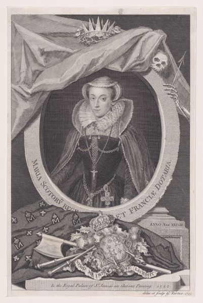Curator: This engraving captures Brigitta Iflinger at the age of 66, dating likely to the late 17th or early 18th century. A rather austere portrait, wouldn't you agree? Editor: Immediately, I notice the density of line work. It creates a fascinating texture across the surface, mimicking the different fabrics and surfaces represented. The interplay of light and shadow is remarkable for an engraving. Curator: It's interesting to consider what engraving meant for portraiture at this time. Engravings democratized images. Think of the labor invested: the engraver, the printing press, the distribution of prints to a wider, literate audience... Editor: Quite. And the artist carefully considers how to translate visual data – color, volume, texture – into a language of pure line. See how they articulate the fur stole versus the plain fabric of her dress simply through density and direction of marks. Curator: Consider also Brigitta herself – clearly a woman of some standing to afford a portrait, even a printed one. The inclusion of her family crest reinforces status, as does the meticulous depiction of her garments. We should note how clothing reflected societal and economic realities. Editor: Yes, the fur indeed. But I am drawn to the almost caricatured quality of the face, especially in contrast to the relative realism of the clothing. The engraver emphasizes her age. Curator: That directness also speaks to a shift away from idealized portrayals. And it's a lasting record, produced through the specific means of reproductive engraving which allowed more people to view images like this than would ever afford an original painting. Editor: Precisely. This piece operates not just as a record of someone's visage, but as an object lessons in how material manipulation creates meaning and distributes it to a wider consumer base. A potent, if humble, image.