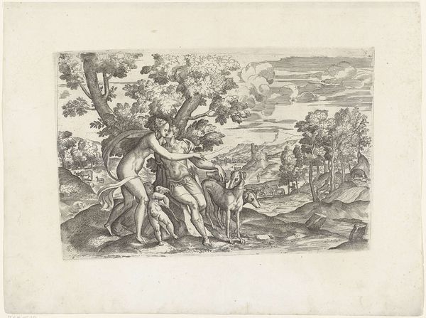 Editor: So, this engraving from 1675 is titled "God waarschuwt Isaak niet naar Egypte te gaan," which translates to "God Warns Isaac Not to Go to Egypt." It's crafted with ink using engraving and etching. I notice how the ethereal figure of God contrasts sharply with the grounded, almost reluctant posture of Isaac. What strikes you most about this work? Curator: What immediately grabs my attention is how this piece participates in the visual language of power. Consider how God is depicted here. The patriarchal figure hovers in the clouds, his body language dominating Isaac’s submissive posture. Does this artistic choice simply depict a biblical narrative, or does it subtly reinforce existing power structures within 17th-century Dutch society? Editor: I hadn't thought about it that way. It's like the artist is making a statement about divine authority, reflecting the social hierarchies of the time? Curator: Exactly. How do we unpack the politics inherent in representing a moment of divine intervention? Are we meant to unquestioningly accept this depiction of authority, or are there subtle invitations to question the artist's, or perhaps even society's, interpretations of faith and leadership? Where might you situate such narratives in relation to contemporaneous discussions of political authority or even emerging colonial endeavors? Editor: That’s a powerful point. The colonial aspect is interesting. It almost frames the promised land as divinely sanctioned territory. Curator: Indeed! How might thinking about the power dynamics represented here reshape our understanding of both the artwork itself and the era in which it was produced? Editor: I see how thinking critically about the underlying power dynamics can add new dimensions to understanding this piece. Thanks, this has been really insightful. Curator: And for me too; seeing art through a contemporary lens always sparks fresh appreciation.