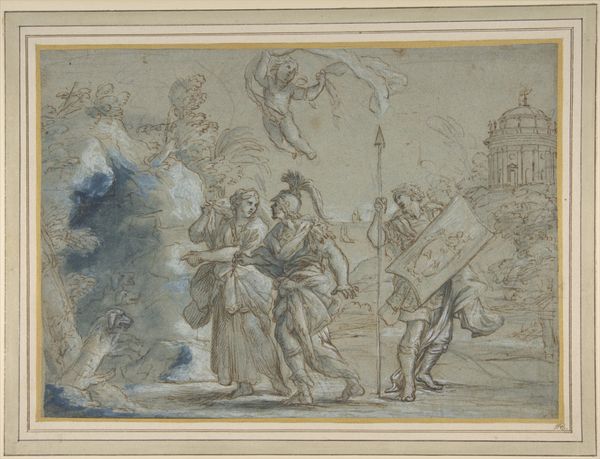 Louis Gauffier rendered "The Coronation of the Allegories of Painting" using pen and brown ink with gray wash on paper. Gauffier painted this during a period when the French monarchy was tottering. Here, three female figures, likely allegories of painting, approach a statue of a winged male figure, perhaps representing genius or artistic inspiration. This scene evokes classical antiquity, yet, within its idealized forms, it subtly reflects the gendered dynamics of the art world during Gauffier's time. Women artists were often relegated to specific genres such as portraiture and still life, and excluded from history painting, the most esteemed category. By presenting these female figures as allegories, Gauffier acknowledges women's presence in the arts, while reinforcing their symbolic rather than actual power. The emotional resonance of this piece lies in its quiet tension between aspiration and the limitations imposed by societal norms, prompting reflection on historical and contemporary struggles for recognition and equality in the arts.